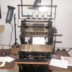 Tim then moves on to a Hickok board shear from 1869, a massive wooden apparatus. If you can think of a carpenter's workbench with a vice and plane all in one, it might give you an idea of this impressive machine. Now, I don't want to give the whole experience all away, so I will just say that Tim continues to move from machine to machine, explaining in great detail the inner workings of machines like guillotine paper cutters and bookbinding sewing machines. As we move about the museum, we also see diagrams and pictures on the walls of binderies and the people who worked in them, which Tim brings this to life with his words.
