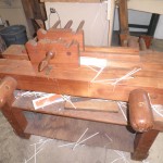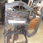 The museum itself is made up of two rooms filled with presses, guillotines, binding machines, hand tools, and photographs. The first things you notice are the big pieces of equipment. For instance, just past the wooden hand sewing binding frame, a large cast iron press catches your eye. The press, we're told, is an English 1832 Imperial Arming Press used for embossing or stamping. Tim explains and demonstrates how the press and its tools work.
