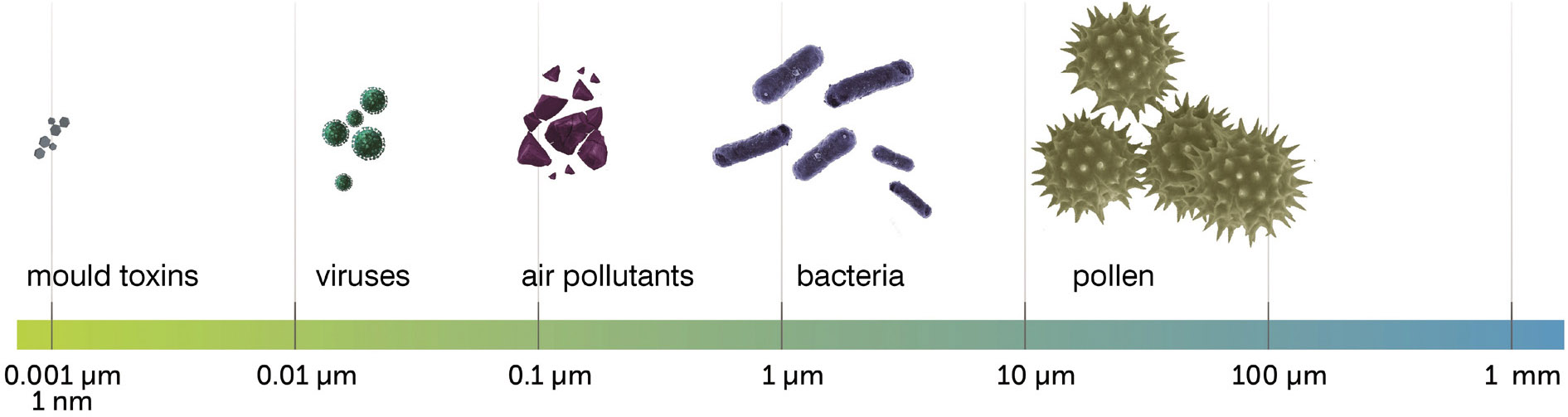 Specific indoor impurities will always vary depending on geographical and other factors, but the most common generalized indoor impurities tend to be mold spores, viruses, air pollutants, bacteria, and pollen. The Genano 310 is rated to handle particles as small as 0.003μm, but what does that mean. How large are dangerous air impurities and can the Genano 310 handle them? Check out the graphic below.